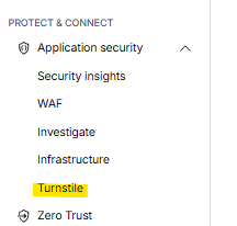 左のメニューから「Application security」-「Turnstile」をクリック。