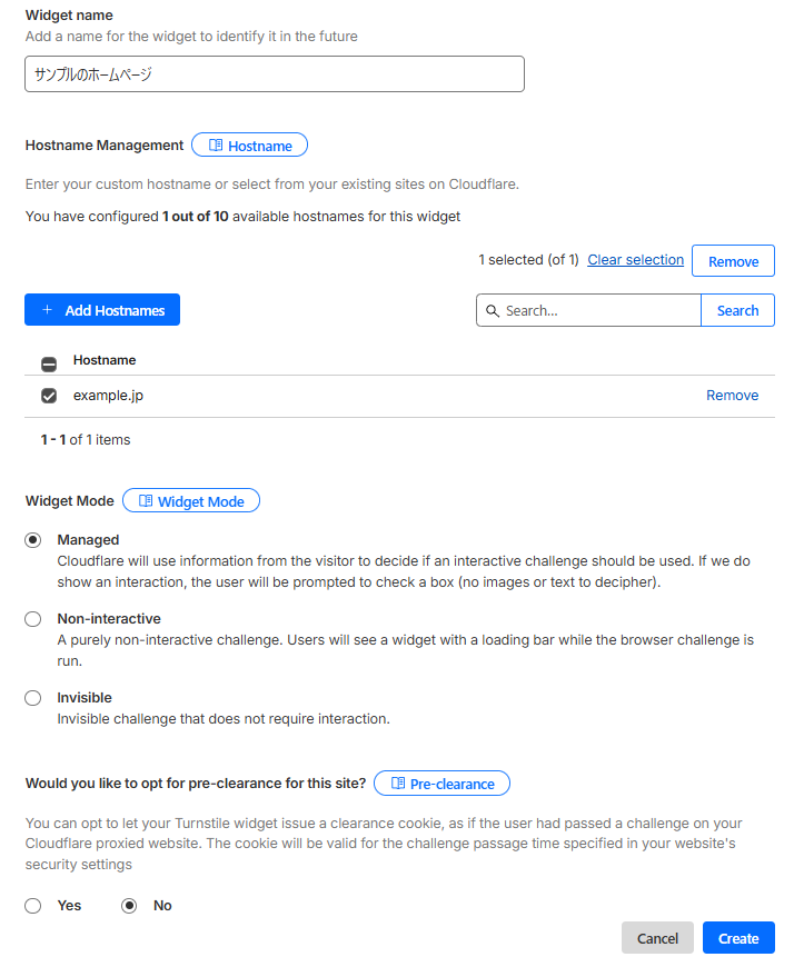 Turnstile widgetsの「Add Widget」ボタンをクリック。