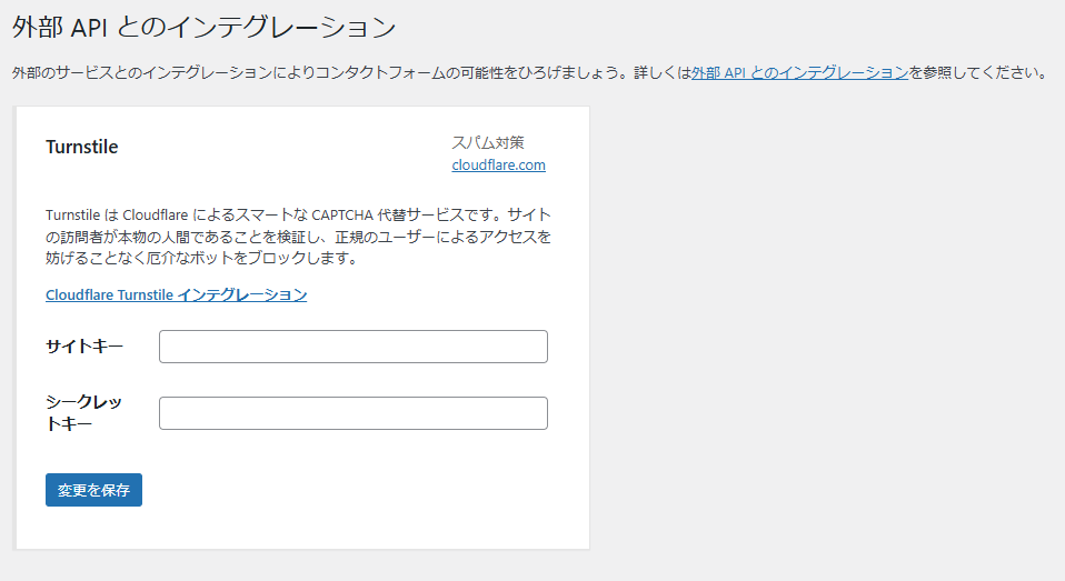 先ほど発行したサイトキーとシークレットキーをそれぞれコピー&ペーストして、「変更を保存」ボタンをクリック。