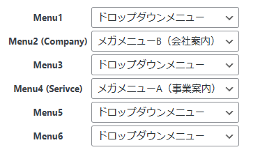 ドロップダウンメニュ、メガメニューAとBがあるので、それぞれを調整してあげるのがよさそう。